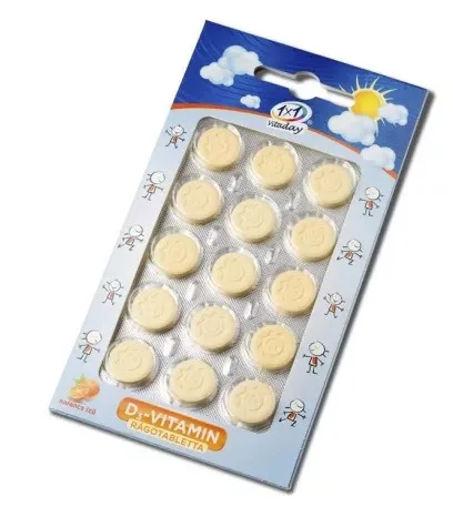 Suplement diety tabletki do żucia o smaku pomarańczowym. Preparat zawiera 1000 mg witaminy 12,5µg (500 NE) witaminy D3 oraz 12 mg ekstraktu z dzikiej róży.