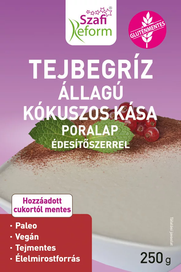 A Szafi Reform tejbegríz állagú kókuszos kása poralappal percek alatt készíthetünk a tejbegrízre emlékeztető, hozzáadott cukormentes, csökkentett kalóriatartalmú, élelmi rostokban gazdag desszertkrémet.